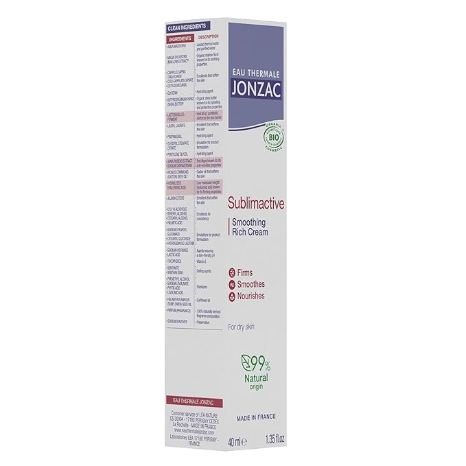 - Anti-Aging Formula: Sublimactive’s organic formula contains 25% Jonzac thermal spring water, celebrated for its anti-aging properties, and natural biomimetic hyaluronic acid, known for its exceptional firming effects.