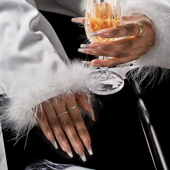 BTArtboxnails XCOATTIPS Long Coffin French Tip Cat Eye Press On Nails with Builder Gel and Mini Nail Lamp Set