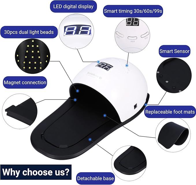- Quick Drying and Time Efficient: With 48 watt power, our uv nail lamp for the foot provides quick drying capabilities. Despite its low wattage, it can shorten your curing time by up to 50% compared to other dryers, making your manicure or pedicure quicker and more efficient