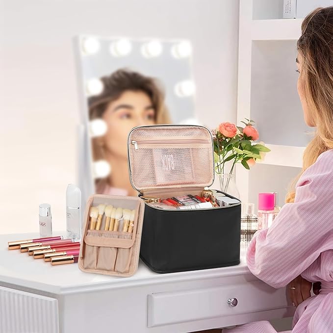 OCHEAL Travel Makeup Bag, Large Make up Bag Organizer Cosmetic Case with Detachable Brush Divider and Multi-purpose Comparement,Waterproof Portable for Toiletry Accessories Makeup Tools-Black