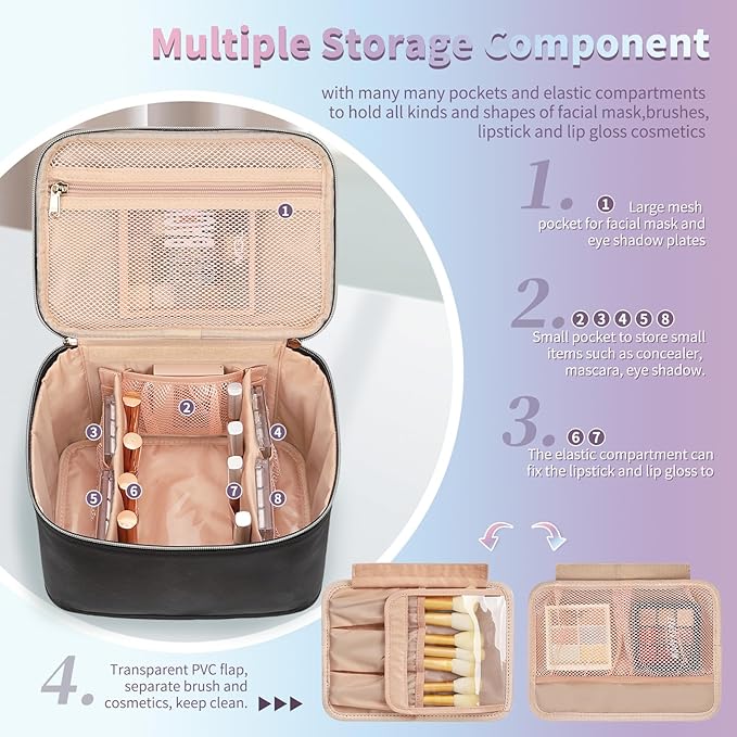 - Separate Compartment - Cosmetic travel bag comes with a separate Brushes and Facial mask area to hold brushes and Facial mask to protect them from dust