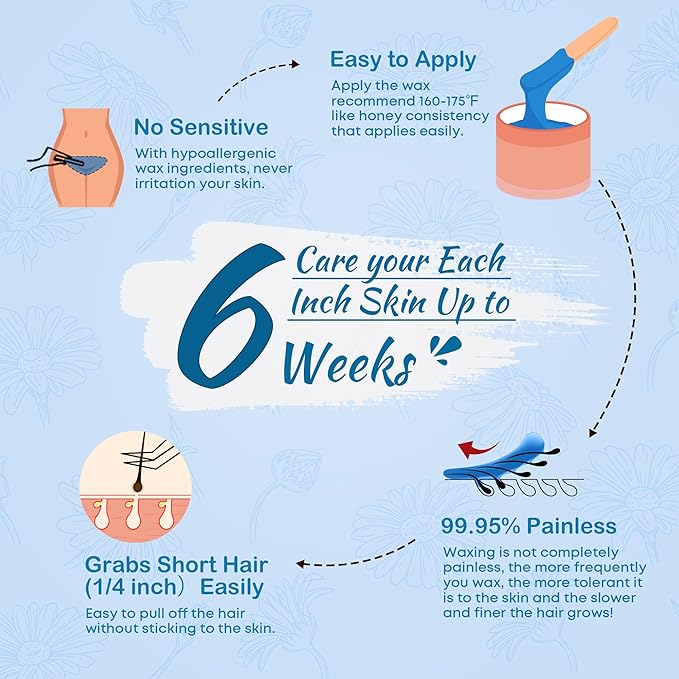 - LOW-TEMPERATURE MELTING POINT: Designed for safety and comfort, our wax beads melt at a low temperature to prevent skin burns, ensuring a pain-free waxing experience. Suitable for both professional beauticians and first-time users, our wax simplifies the hair removal process at home