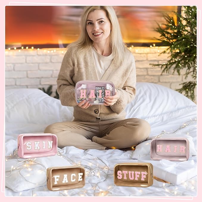 Pinkunn 4 Pcs Preppy Makeup Bags Christmas Chenille Letter Bag Face Skin Hair Stuff Cosmetic Bag Corduroy Makeup Pouch with Zipper Birthday Gifts for Women(Pink)