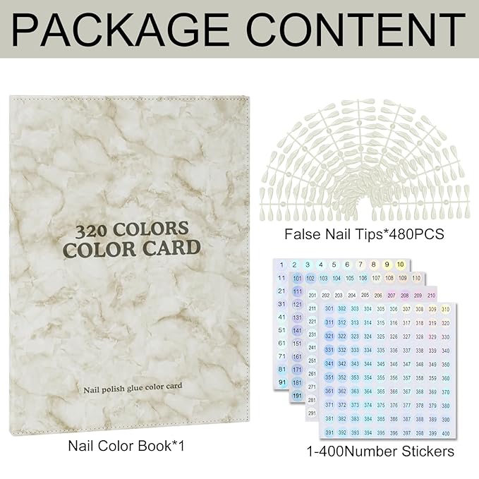- NAIL COLOR DISPLAY BOOK:Color:White | Material:Leather | Card slot: 320 | Installation:card slot plug-in, no glue requiredk,easy to replace | Packing list:1*Nail Color Book;480pcs False Nail Tips;1-400 Number Label.