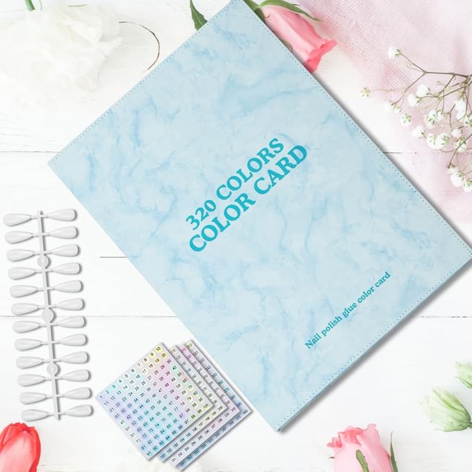 - NAIL COLOR DISPLAY BOOK:Color:Blue | Material:Leather | Card slot: 320 | Installation:card slot plug-in, no glue requiredk,easy to replace | Packing list:1*Nail Color Book;480pcs False Nail Tips;1-400 Number Label.