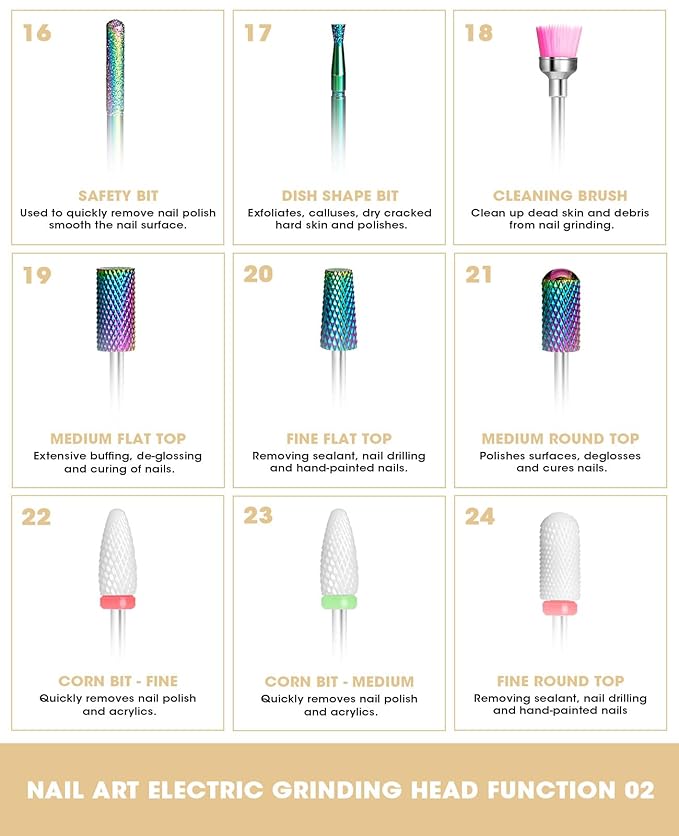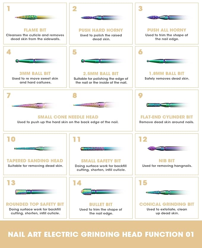 - Multifunctional Carbide nail Drill Bits: Most of the 3/32-inch electric nail polishers on the market, can meet different needs such as acrylic gel nail removal and polishing, nail surface cleaning, and hard and thick skin trimming in the cuticle area. Compared with traditional hand sanding, it is more time-saving and efficient, suitable for beginners and professional manicurists. Perfect for nail salon, beauty salon, spa or personal manicure pedicure, DIY manicure at home.