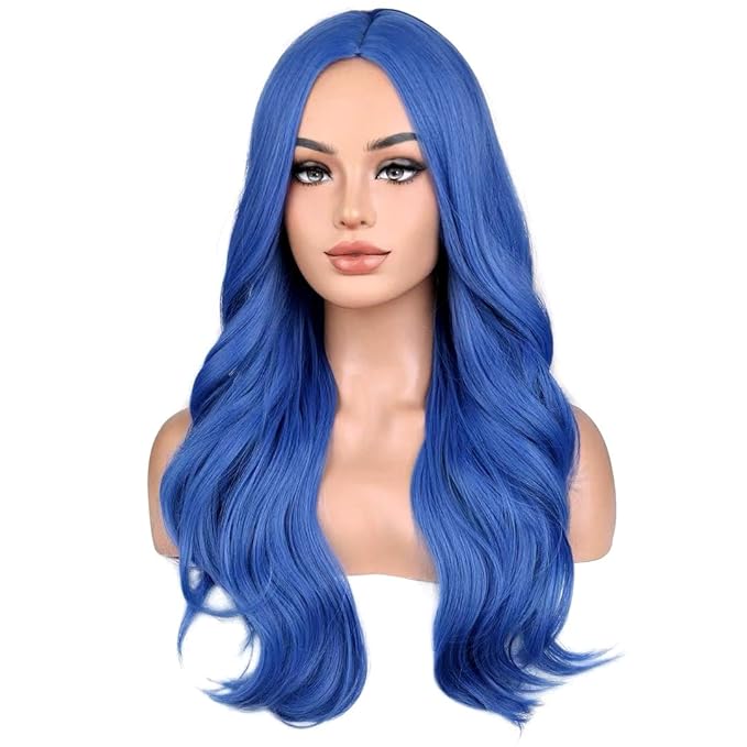 BERON Blue Wigs Long Wavy Wig for Women Natural Curly Dark Blue Heat Resistant Synthetic Hair Wigs for Cosplay Party Daily or Used