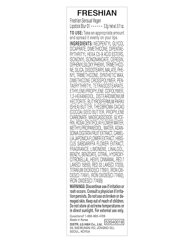 - FRESHIAN SENSUAL VEGAN LIPSTICK BLUR (01 Pleasure, 3.3g/0.12oz) - This lipstick provides a matte, yet smooth, lightweight finish that enhances your natural beauty while keeping your lips nourished and comfortable all day. Enriched with Flower Complex, a blend of hibiscus, camellia, and Provence rose extracts, it ensures your lips stay lively and moisturized.