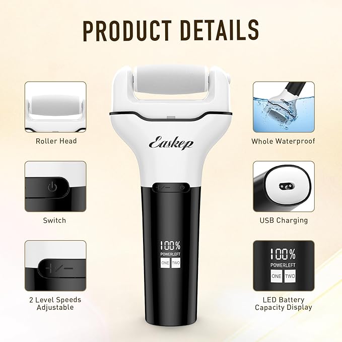 - 3 Roller Heads & 2 Speeds Adjustable -- The electric callus remover comes with three different quartz sand grinding heads and two working modes - a low speed of 3000RPM and a high speed of 3500RPM - For everyday maintenance or skin with fewer calluses, low speed is ideal. For feet with thick calluses, high speed is ideal