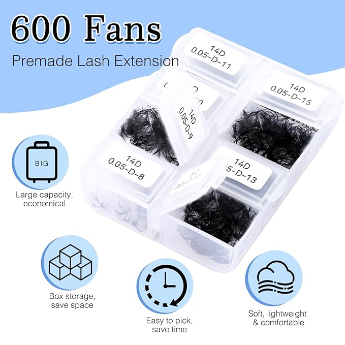 - Economical and Affordable: Obeyalash premade loose fans come in packages of 600 fans/box, equivalent to 5 boxes of 12 rows of premade fans lashes . Each box has 8 separate grids. (8mm/9mm/10mm/15mm 50 Fans per grid, 11mm/12mm/13mm/14mm 100 Fans per grid).