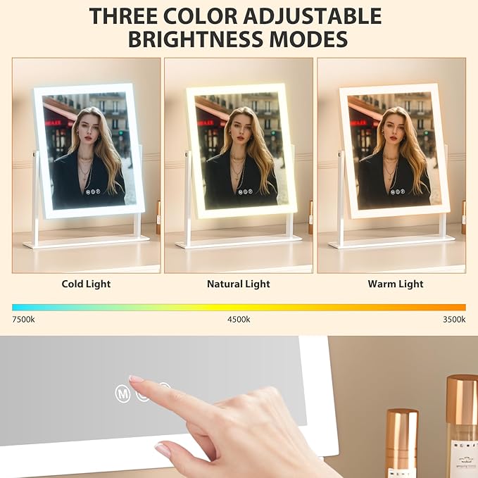 - 【ADJUSTABLE BRIGHTNESS WITH 3 COLOR LIGHTS】Hollywood Makeup Mirror with 3 color modes: Warm (3000K), Cool White (6500K), and Natural Light (4000K). Lighted vanity mirror with touch screen switch, light up at the touch of a button, and adjustable brightness from 20% to 100%. Perfect for flawless makeup in any light, ideal for all occasions.