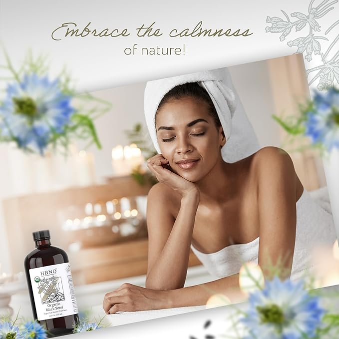 HBNO Organic Black Seed Oil - Huge 16 oz (475ml) Glass Bottle Value Size - USDA Certified Organic Black Seed Oil, Cold Pressed for Face, Body, Lips, Shampoo & Conditioner