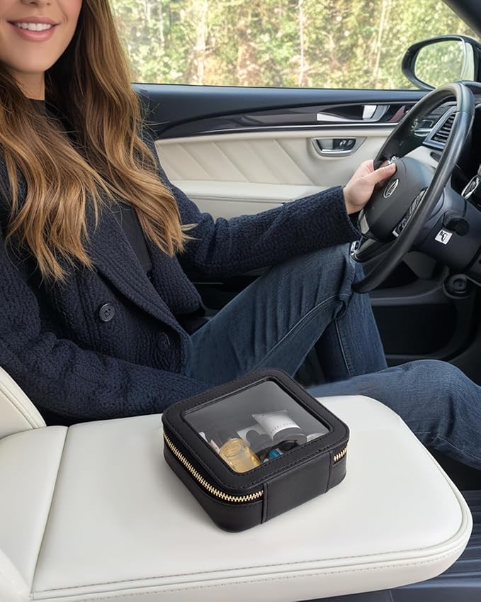 - Car Must Have Essential: Our car essentials small pouch travel toiletry bag is roomy to store your makeup brushes, lipstick, eyebrow pencil, make-up foundation, cables, chargersor and other little items.It make your daily make-up, cream, lipstick, perfume and other beauty things organized and protected.This clear mini toiletry bag can be a good car accessory fits in the center console or other parts of your car.