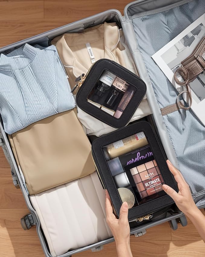 - Clear Design: Our 2Pcs Travel Makeup Bag is elegant ,and stylish, this makeup travel organizer was designed in a minimalist boxy shape,is sleek and minimalistic look for your makeup accessories collection. And is designed with a transparent PVC window,all items are clear at a glance, and you can quickly choose the cosmetics you need.Portable and lightweight Slip it into your purse, backpack, everyday tote or travelling bag for easy access to your must-have items. Large Size:8.1'' x 6.1'' x2.5'', Mini Size:5.1'' x 4.8''x 2''.
