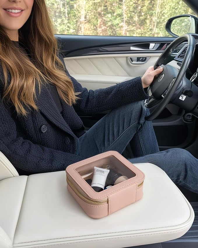 - Car Must Have Essential: Our car essentials small pouch travel toiletry bag is roomy to store your makeup brushes, lipstick, eyebrow pencil, make-up foundation, cables, chargersor and other little items.It make your daily make-up, cream, lipstick, perfume and other beauty things organized and protected.This clear mini toiletry bag can be a good car accessory fits in the center console or other parts of your car.