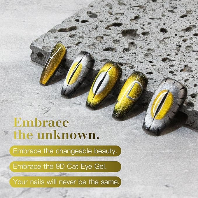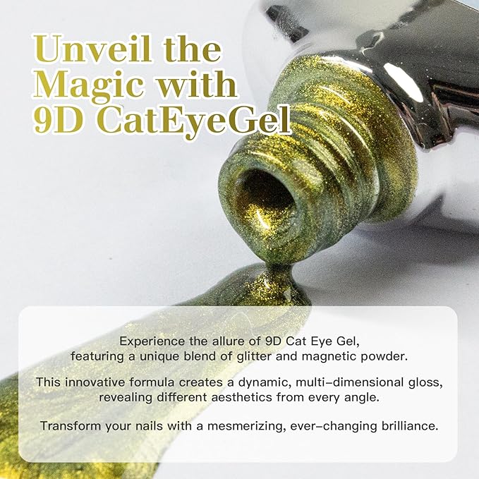 - 9D Cat Eye Effect: Elevate your nail art with the SAGEBIO 9D Cat Eye Gel Nail Polish Set. This set includes a 15ml bottle of black gel and a 15ml bottle of cat eye gel, along with a silicone handle cylinder magnetic stick that creates stunning 9D patterns such as galaxy, starry sky, cat's eye, galactic hole, slash, and more.