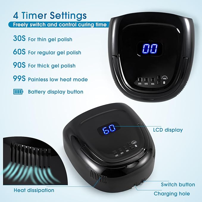 - [4 Timer Settings] Featuring a display screen, the nail lamp allows you to easily view and select the curing time. With timer settings of 30s, 60s, 90s, and 99s, it caters to the needs of beginners and experienced manicurists. You can choose the appropriate curing time based on the thickness of the gel. The 99s low heat design provides temperature protection for your hands, ensuring a painless curing process.