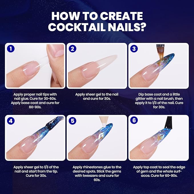 - Cocktail Collection: This Gel Polish Set is inspired by the cocktail culture at American parties. It mimics the color transitions of cocktails, enhancing the festive vibe of your party outfit.The collection inclues 9ML Color Gel Polish*4,10ML Base&Top Coat*1,7.5ML Nail Glue*1,Medium Stiletto Nail Tips * 120 pcs (12 sizes),5g Rhinestone Glue Gel *1,nail rhinestones set *1,Nail Glitter*2,Nail Tips Holder Set*1,Rhinestone Picker Pencil*1,Tweezers*1,Nail Brush*1