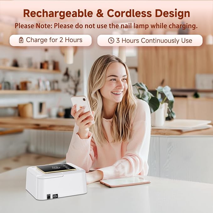 - Cordless & Rechargeable Nail Cure Lamp : Meremit gel nail lamp equipped with 4000mAh large-capacity battery, enables the nail light to work over 3 hours continuously after 2 hours fully charged.Unlike other corded nail lamp, our nail uv light is portable to take anywhere without messy wire and provide you a professional & enjoyable manicure experiences