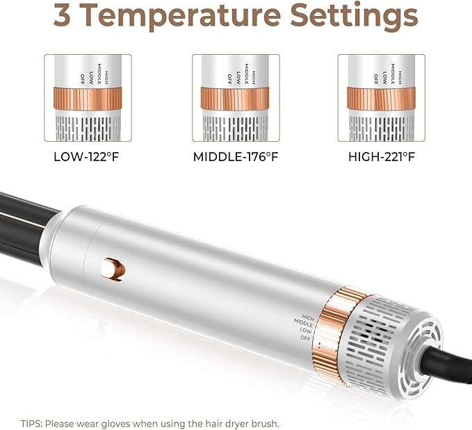 - 3 TEMPERTURE SETTING FOR ALL HAIR: Blowdryers brush for hair supplies 3 temperature settings to adjust the heat. Magic styler is suitable for different hair types. High: quickly shape for thick & pre-dried hair. Middle: Suitable for long-lasting hairstyles you set. Low: Suitable for fine, soft, damaged & treated hair. The Hair brush blow dryer can effectively dry hair without damaging the hair, and it is flexible to set various hairstyles you want. Choose the best temperature for your hair.