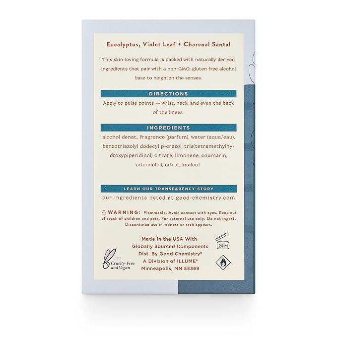 - Notes: eucalyptus, violet leaf, charcoal santal