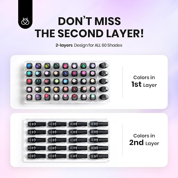 - What You Get: Beetles gel polish set includes 5ml Color Gel Polish x 60,7.5ml Base Coat x 2,7.5ml Glossy Top Coat x 2,7.5ml Matte Top Coat x 1,Nail Buffer x 1(Pink and white are shipped randomly),Nail File x 1,Nail Clipper x 1,Cuticle,Stick x 1,Instruction Manual x 1。