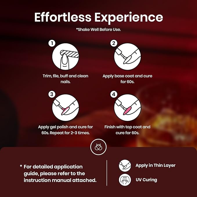 - 【Suggestion】: When you receive gel nail polish, please read the instructions carefully before using, and operate according to the instructions, which is simple and convenient. The colors displayed under different light sources and displays are a little different, please don't be confused, just use it with peace of mind.