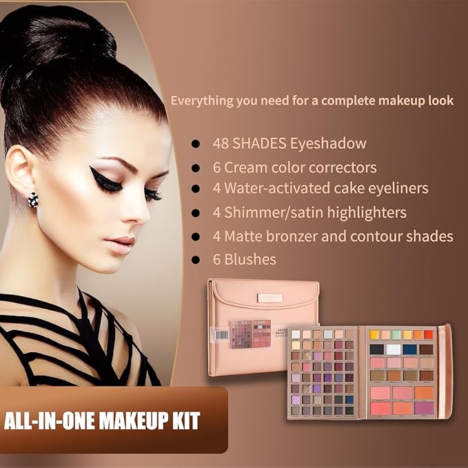 - COMPREHENSIVE MAKEUP SELECTION: This portfolio includes 48 eyeshadows with various finishes, 6 cream color correctors, 4 water-activated cake eyeliners, 4 shimmer/satin highlighters, 4 matte bronzer and contour shades, and 6 blushes, ensuring you have everything you need for a complete makeup look.