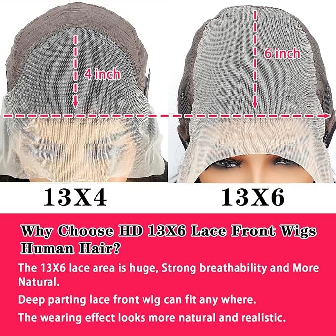 - 13x6 HD Transparent Lace Front Wigs Quality : HD Lace Front Wigs Human Hair 180 Density, No Split Ends. Bleached Knots And Pre plucked With Natural Hairline , Offer You Very Natural Hairline. 6 Inch Parting Space,Can Make High Ponytail & Bun