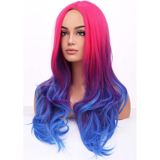 BERON Rose Ombre Blue Wigs Long Wavy Wig for Women Girls Hot Pink Blue Heat Resistant Synthetic Hair Wigs for Cosplay Party Daily or Use