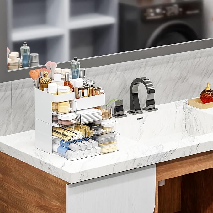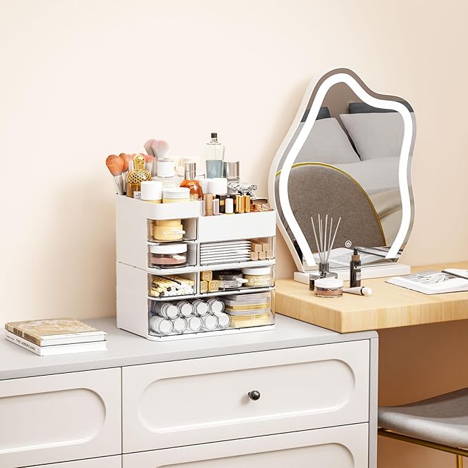 - 【Large Capacity】 Our makeup storage has 3 large drawer and 3 small drawers,8 top compartments for holding moisturizer,lotions,lipsticks,nail polishes,makeupbrushes,eyeliners,eye shadow palettes and other small everyday collection
