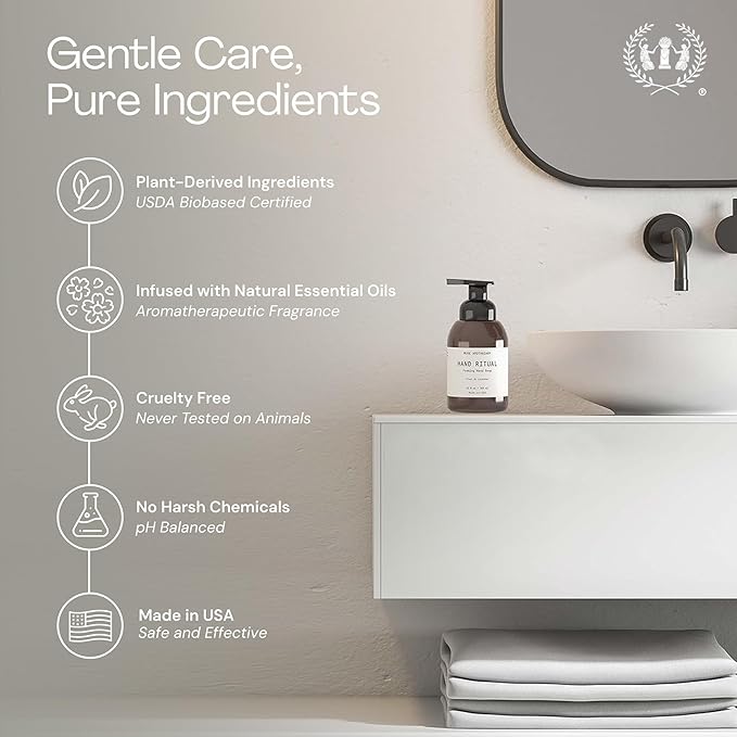 - Hand Ritual - Luxurious foaming hand wash, quickly creates mounds of foamy lather, while naturally cleansing, moisturizing, and softening your skin. Buffs away heavy soils, dirt, grease, and grime while locking in moisture, rinses clean without leaving any sticky residue, formulated for all skin types, and gentle enough for the most sensitive skin. The rich foam consistency provides for an excellent rinse while reducing water usage
