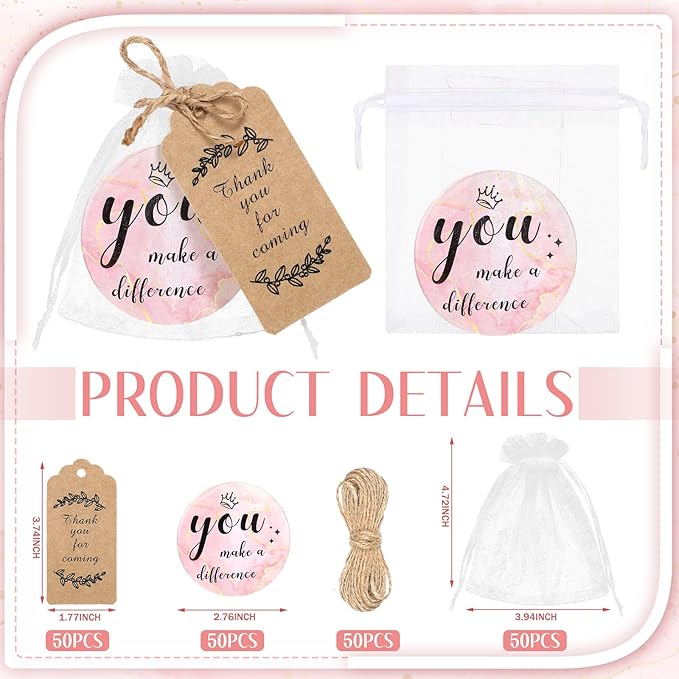 - Gifts to Celebrate Womanhood: the gifts set includes 50 pocket mirrors bearing powerful and inspirational messages, 50 thank you cards, and 50 organza bags to gift your beloved lady friends; The back of these handy compact mirrors [you make a difference]; Truly a heartwarming thought to keep your friends inspired and empowered