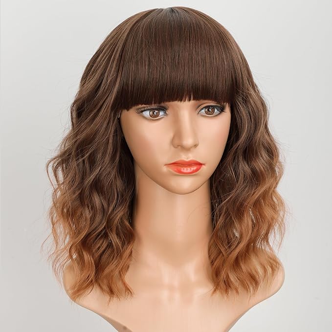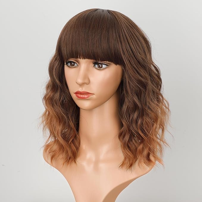 AISI HAIR Synthetic Wavy Curly Bob Wig with Bangs Ombre Brown to Auburn Brown Wig Short Hair for Women Synthetic Heat Resistant Bob Wigs