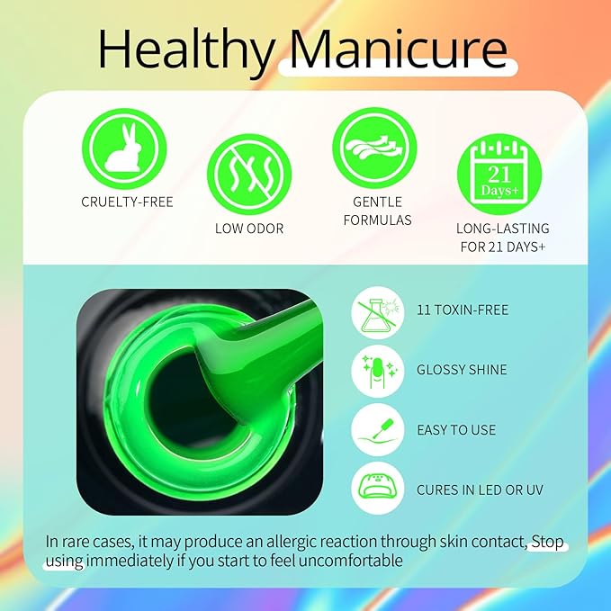 - 【Long Lasting No Peel-off & Bubble Free】 - This neon rainbow color gel polish set is highly pigmented and have good tenacity. with proper application, not easy to peel off and no chipping, can keep about 3 weeks long lasting. Provide shiny glossy and smoothy matte effect.