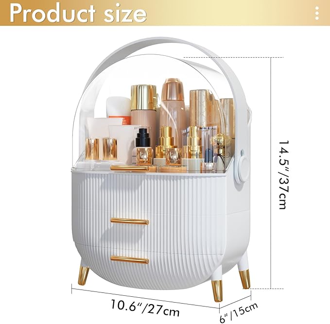 - Product Size: The Cosmetics Display Case measures 10.6×6×14.5 inches. Featuring a light luxury style with a white body, transparent acrylic lid, and golden handle, it adds elegance to your vanity