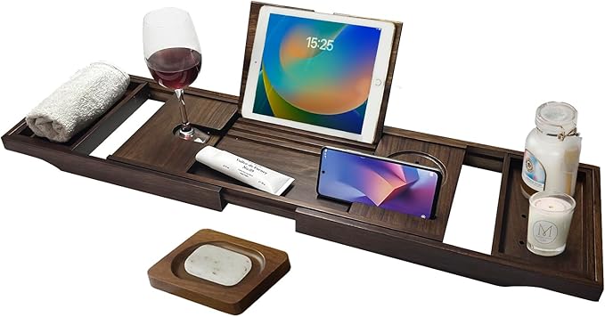 - Luxury Home Bath Tray: bath tub caddy comes with slots for a phone, a wine glass slot, a scented candle/water glass slot, 2 trays and tablet/bookshelf, plus a soap holder. Enjoy a spa day at home with a bath table tray that can be used to store all your favorite personal items to make your bathing experience as comfortable as possible