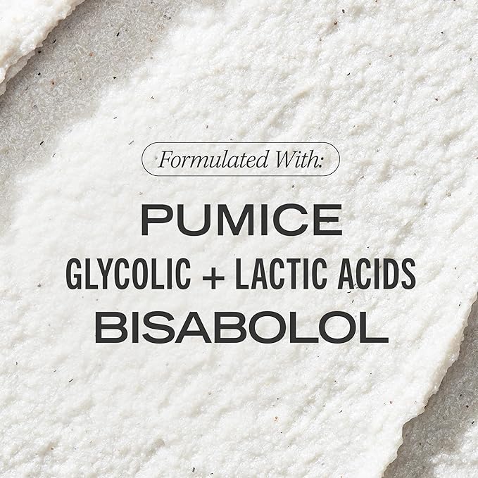 - Buff Away Dead Skin: Glycolic and Lactic Acids at a combined level of 10% help loosen skin’s top layer and decongest pores, while Pumice Buffing Beads (NOT microplastic!) whisk it all away