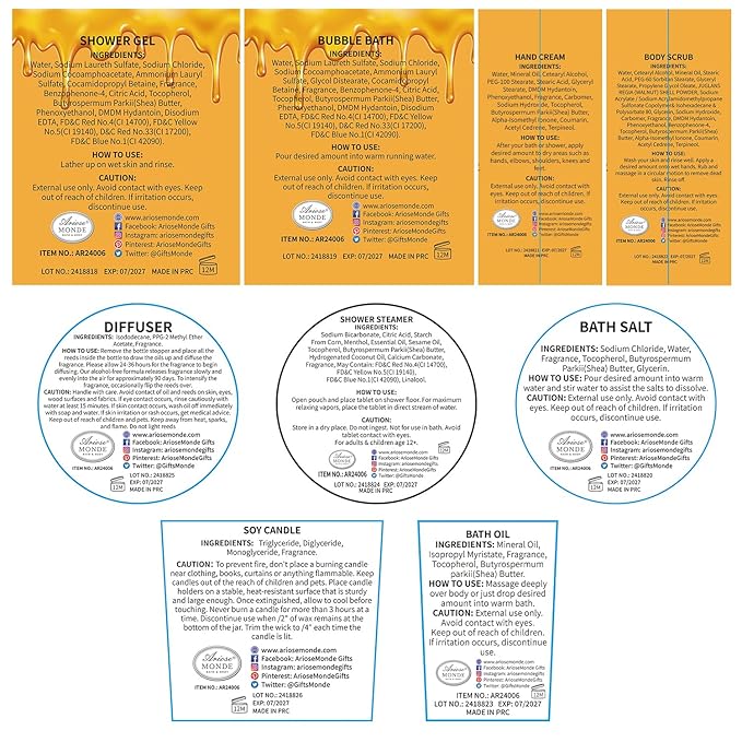 - UNIQUE 13 PIECE BATH SET - Our deluxe self-care package is filled with all the body soothing spa essentials a woman needs! Bubble bath, shower gel, bath salt, body scrub, hand cream, scented candle, bath oil, 2*shower steamers tablets, diffuser, 5pcs reed sticks, silk eye mask. Packed in a stunningly wrapped in a handmade basket, it also has a gift note card for you to personalize it.