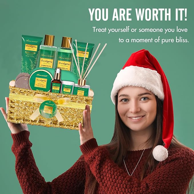 - Spa Gifts For Women: Our Eucalyptus spa gifts baskets can help her relax body and mind. The aromatherapy candle fills the room with a soothing fragrance, while the bath salt and bath bomb offer a spa-like experience in the comfort of one's own home, she could pamper and indulge herself with a deluxe bath salts while enjoying her favorite drink for the special occasion in the fresh fragrance atmosphere. Making this gift box practical as well as luxurious