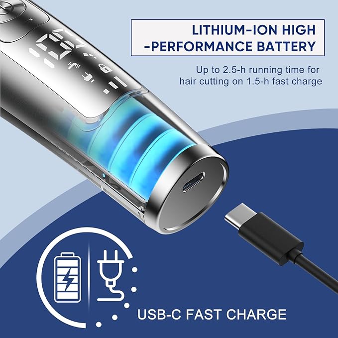 - Smart Display & Fast USB-C Charging Technology: 1.5 hours fast charging, long runing time up to 150 minutes (Built in rechargeable 1200mAh lithium battery). The intelligent display screen technology allows you to have a clearer understanding of the usage status of the hair clipper, making it easier for you to use safely.
