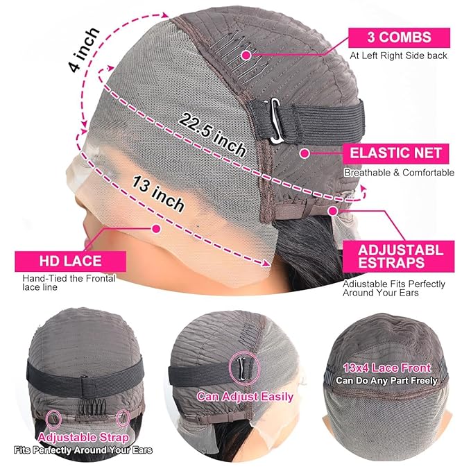 - đź’• Deep Wave Lace Front Wigs Human Hair Cap: Average Cap (21.5"-22.5"), Fit for Most People, with Adjustable Straps and 4 Combs, Clean and Breathable Easy to Install and Adjust,Giving You a More Comfortable Wearing Experience