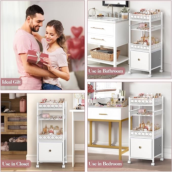 - 【Aesthetic and Functional Makeup Organizer】The latest vanity organizer with stylish flower-patterned fences makes it stand out among other rolling makeup cart. The makeup drawer organizer can store a hodgepodge of products from tall bottles to short jars, including skin care products, cosmetics, beauty accessories, hair tools and more stuff.