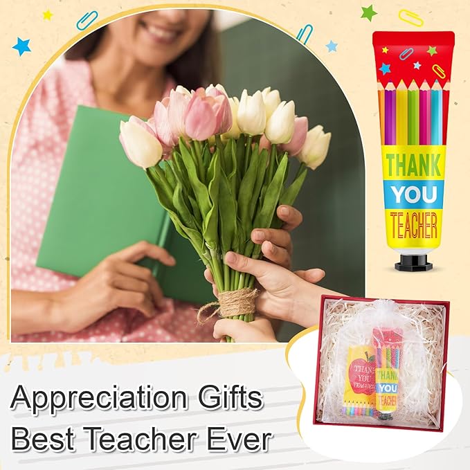 - Cute Design: the hand creams with stars and colored pencils patterns which align well with thank you teacher themes; With each cream, you will receive an eye catching organza bag and a thank you card, both matching our teacher appreciation theme; The thank you cards featuring inspirational text, apple and colored pencils patterns designs, making every set a delightful treat to the eyes