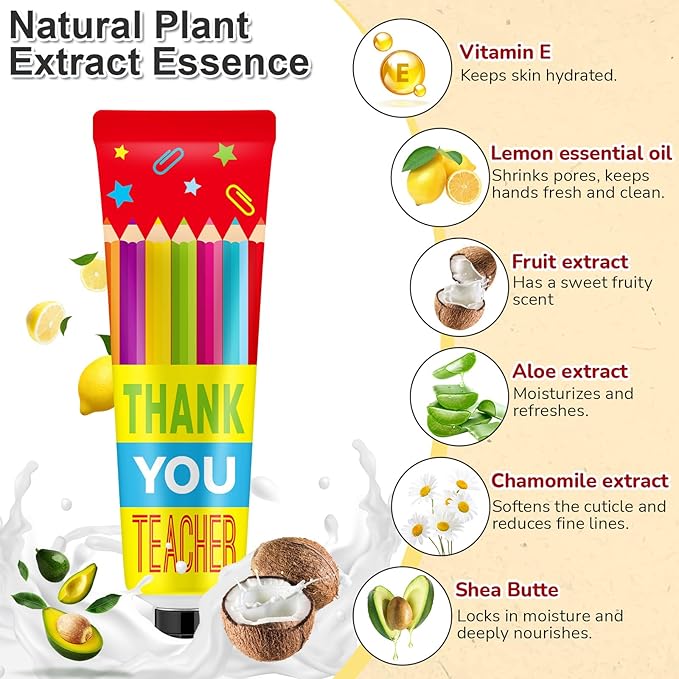 - Teacher Hand Cream Sets: the package includes 24 hand creams, 24 thank you cards, and 24 organza bags; Our hand cream has the delightful aroma of coconut; The fragrances add another layer of sensory delight to the hand cream; The rich aroma derived from these creams leaves the hands smelling pleasant the whole day
