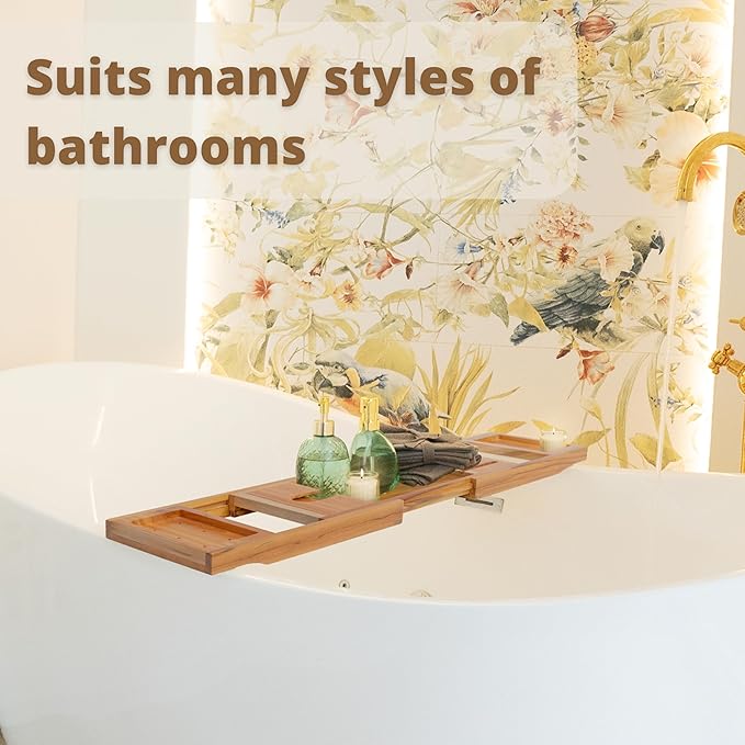 - 100% Natural Teak: TEAKAURA Bathtub Tray is made from premium teak, known for its superior and attractive texture that becomes even more beautiful over time. Unlike bamboo, natural teak boasts a richer color, and each piece showcases a unique grain pattern. Finished with a specially formulated varnish, this bath tray is water-resistant, protecting against water damage and wear from splashes.