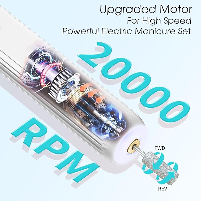 - Easy to use, Even for Beginner: This electric manicure pedicure kit have 3 adjustable speed 0-20,000rpm and designed with forward and reverse rotation directions,choose the appropriate speed and rotation for your needs; ergonomic body design for comfortable holding, speed and direction controlling. Easy to use, enjoy a salon-quality professional manicure pedicure at home. EVEN BEGINNERS CAN USE THIS ELECTRIC NAIL FILE WITH EASE !