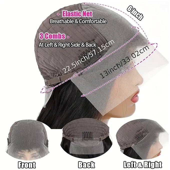 - 13x6 Lace Front Wigs Human Hair: 13x6 Swiss transparent HD lace front wigs human hair, lace material make it more comfortable & breathable. Breathable mesh hair hat with HD invisible small knots, suitable for all skin colors, protective & match your skin naturally. Ear to ear 13x6 larger lace area, supports middle part, side part or braid free part with the 13x6 topper lace part.