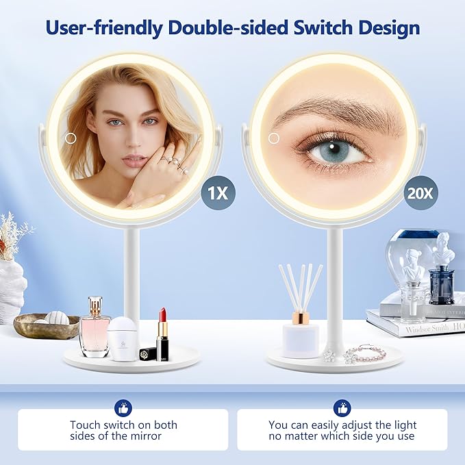 - 20x/1x Double-Sided Magnifying Mirror with Light: This makeup mirror with double-sided design, one side is 1x HD flat mirror, 8.6 inches large enough to see your whole face, suitable for overall makeup checking, flip to the other side is 20x magnifying mirror, which can help with all kinds of fine makeup operations, such as wearing contact lenses, eyebrow trimming, and eye shadow application, etc.