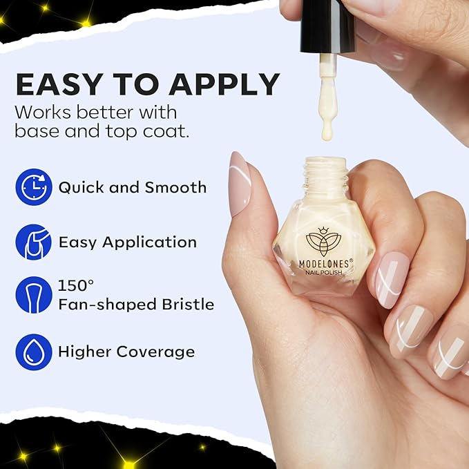 - Long Last & No Chips: Modelones 6 colors nail polish has a 150° wide brush that perfectly fits your nails, ensuring easy and complete coverage. For flawless nails, we recommend applying a second coat after the first layer has dried completely. This ensures a smooth, long-lasting finish that elevates your manicure to perfection. Achieve salon-quality results at home with just two simple steps!